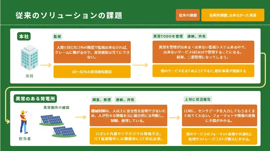 また、年代ごとにトレンドのあるシステムも存在しているので、発電所ごとに監視システムが異なっているというケースも多く、遠隔監視体制が発電所数に比例した労働集約型作業になっております。1500ヶ所の管理を2名体制で行っており、月間100万円以上の管理コストがかかっているケースもあります。Nobest IoTは複数の発電所を一元管理できるシステムのため、24時間体制で監視しながら複数の発電所を担当者1名で運用することが可能となります。 |