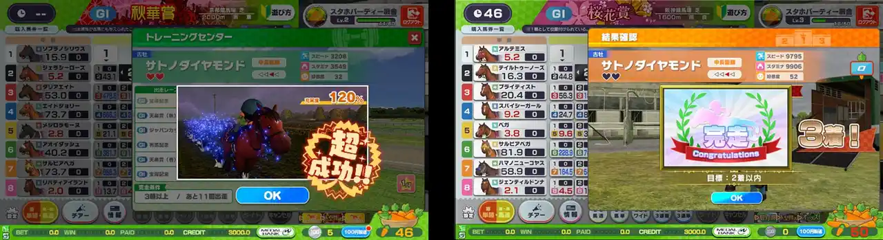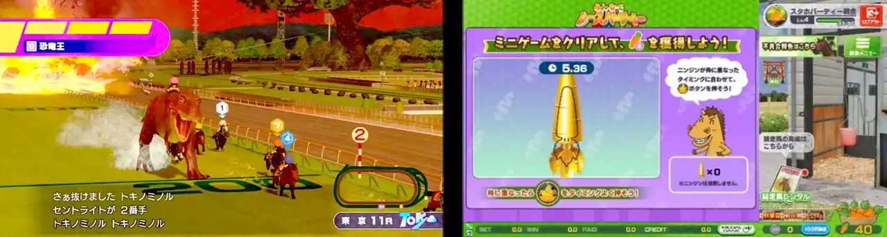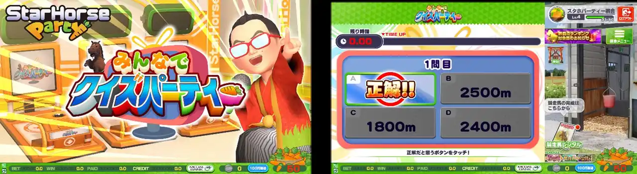 また、同じ筐体のプレイヤー同士で楽しめるコンテンツ「みんなでレースパーティー」「みんなでクイズパーティー」などのシリーズ初めてとなるコンテンツだけでなく、カジュアルながらも実況はシリーズおなじみの杉本清氏が担当するなど、競馬ファンも楽しめる本格的な要素も満載です。 |