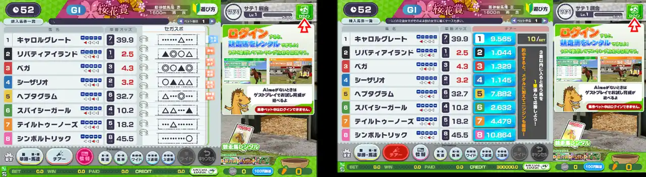 実際の競馬と同様の「単勝」「馬連」などの馬券はもちろん、『StarHorse』オリジナル馬券「ライド」の他に、本作オリジナルとなる新馬券「チアー」が登場。 |