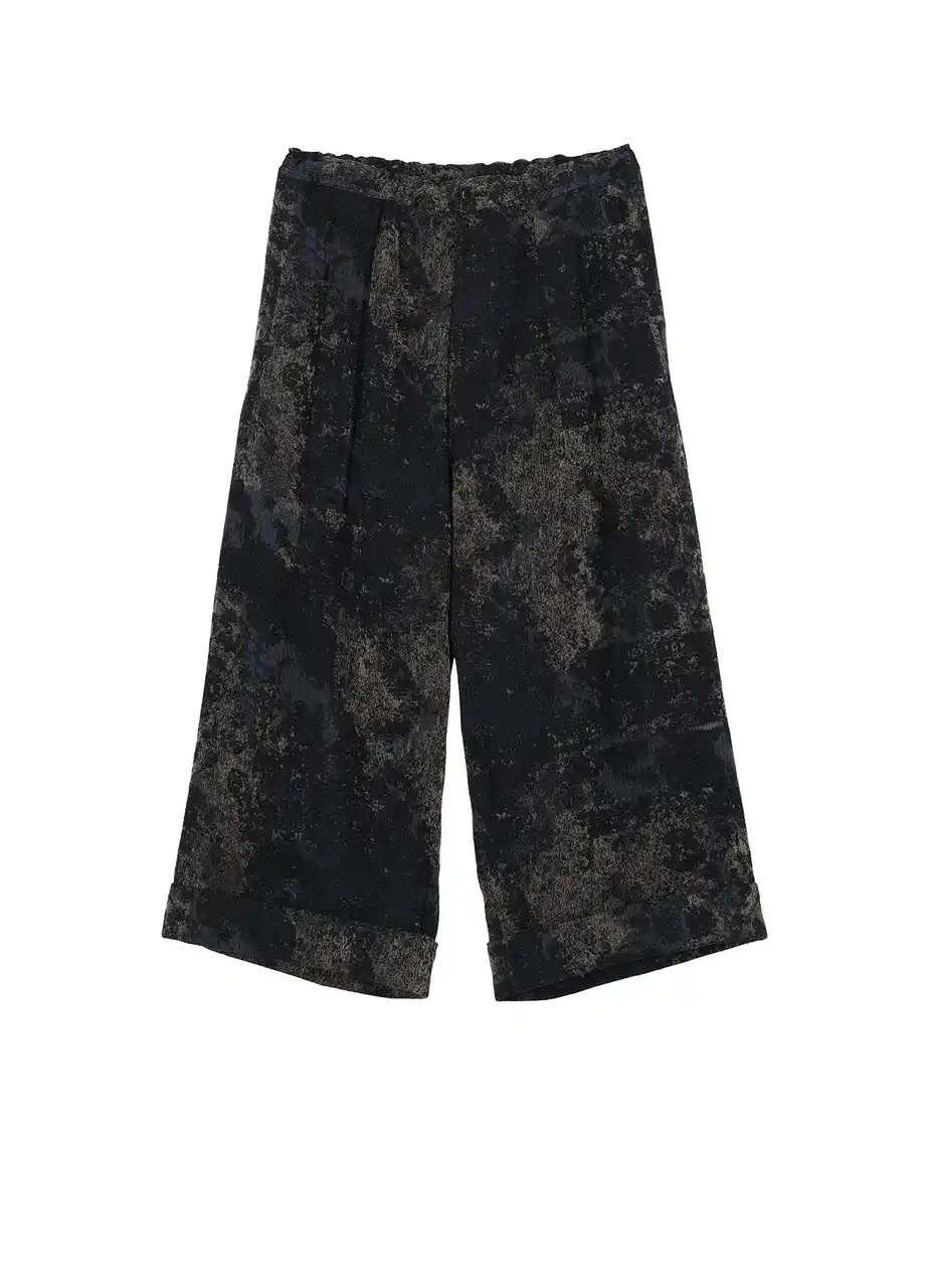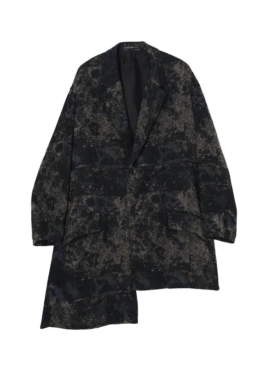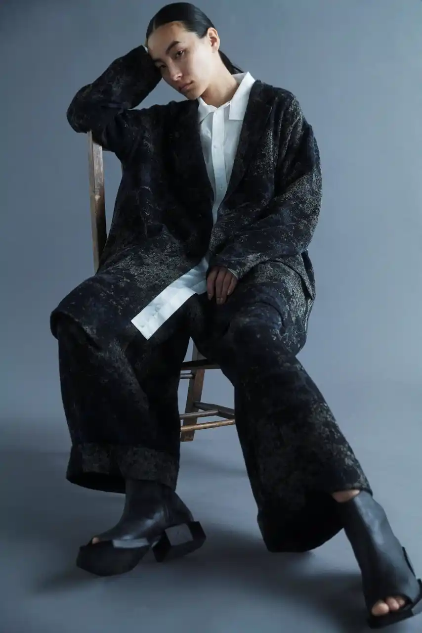 絨毯柄をジャカード織で表現した、アシンメトリージャケットとフロントタックパンツ。 |