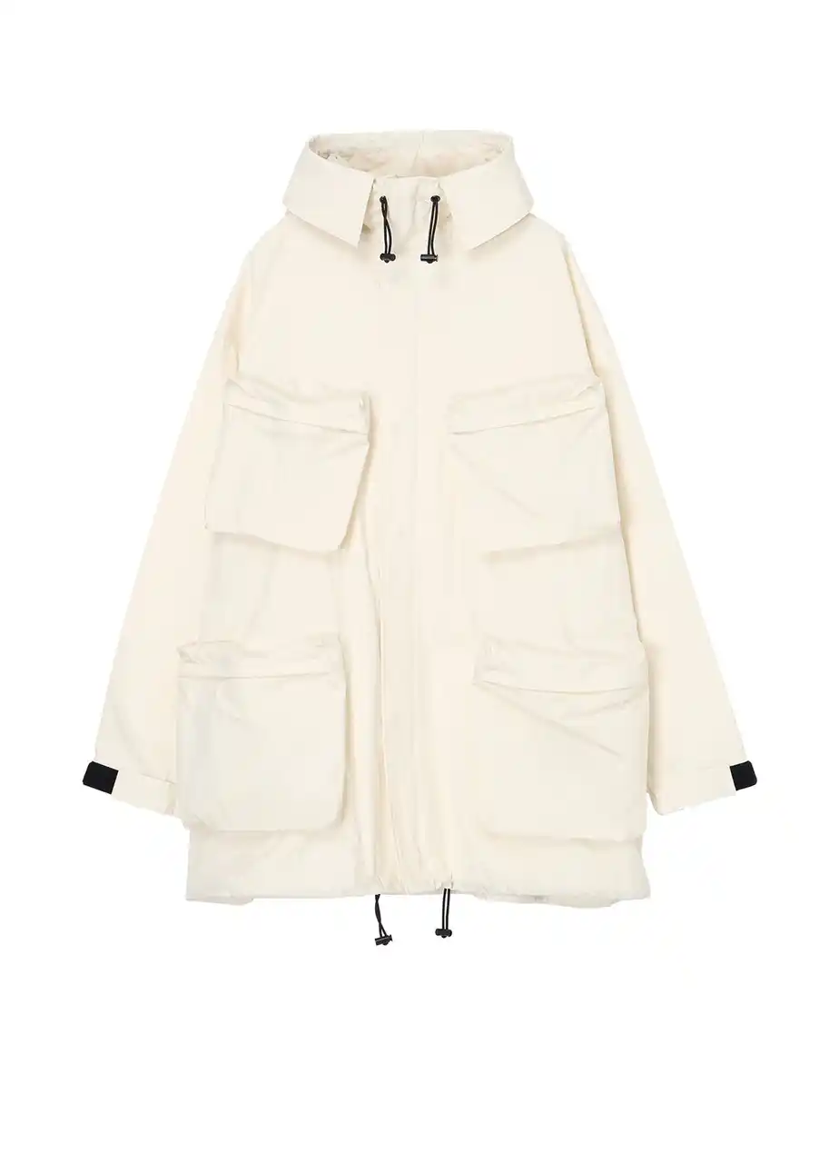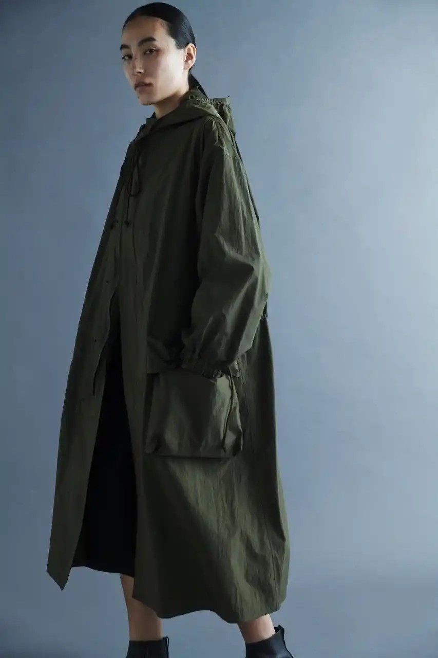 立体的なカーゴポケットを配したオーバーサイズのコートと、ルーズシルエットのパンツ。 |
