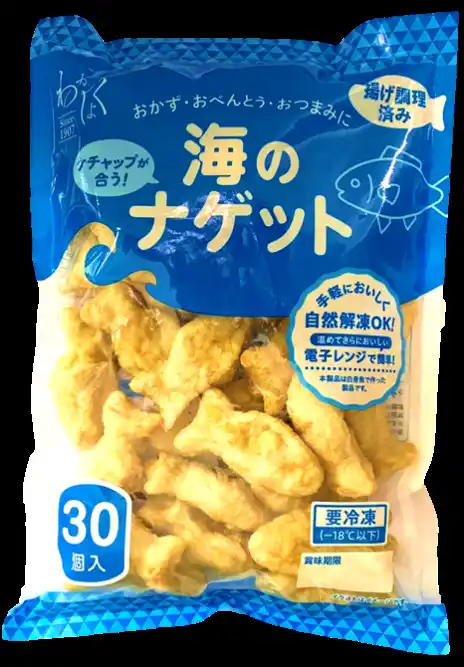 スーパーマーケットの水産コーナーでの店頭販売に加えて、「海のナゲット」は業務用パックも展開。 給食施設、保育園、飲食店、仕出し弁当など、大量調理の現場でも使いやすい仕様で、幅広いニーズにお応えします。 |