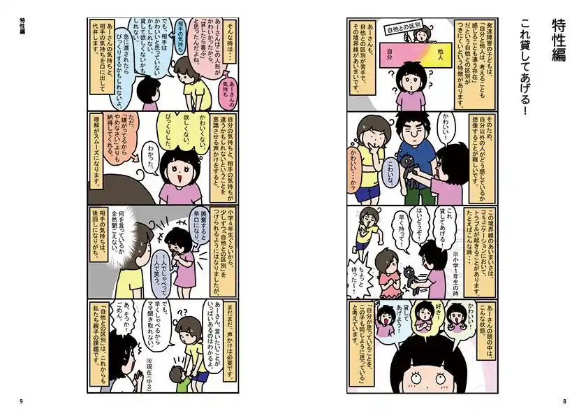 ☑実践的な療育ヒント: 漫画で共感し、コラムで学びを深められる「親子のためのガイド」としても活用いただけます。 |