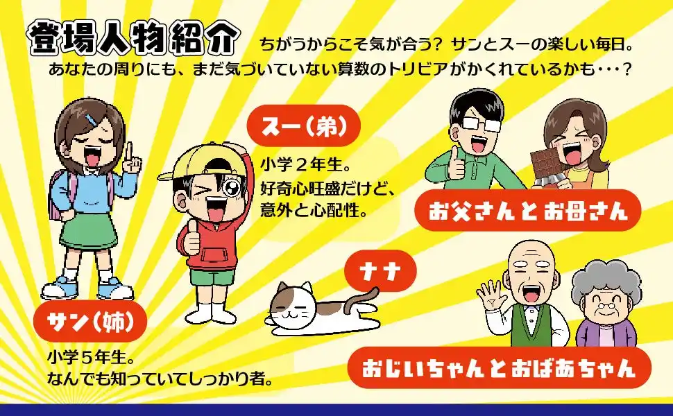 物知りのサン(姉)と、好奇心旺盛だけど心配性のスー(弟)という、小学生2人の楽しい日常生活を舞台に、ギャグ満載の掛け合いが繰り広げられます。1ページ目から思わず笑ってしまう、まさに算数の学習マンガの決定版です。 |