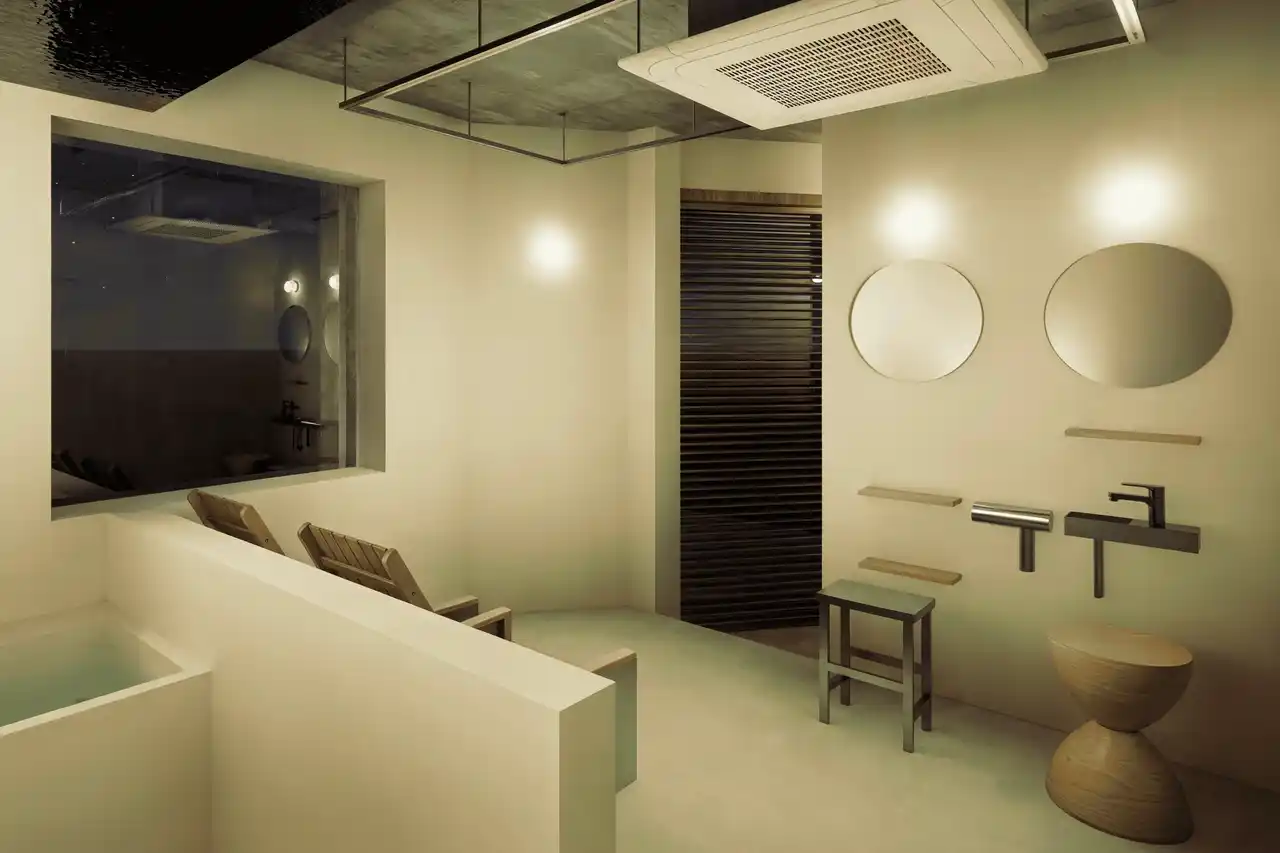 『SAUNA汽汽』は、“完全プライベート × ハーバルスチーム”を特徴とする都市型サウナです。天然ハーブの濃霧スチームで身体を芯まで温め、サウナ室内にシャワーを設けることで、ドイツ由来のクナイプの考え方を取り入れた温冷体験を一室内で完結できる設計としました。安定した低水温を保つチラー設備を備えた水風呂や、サウナ室内でアメニティによるセルフケアを楽しむことも可能です。 |