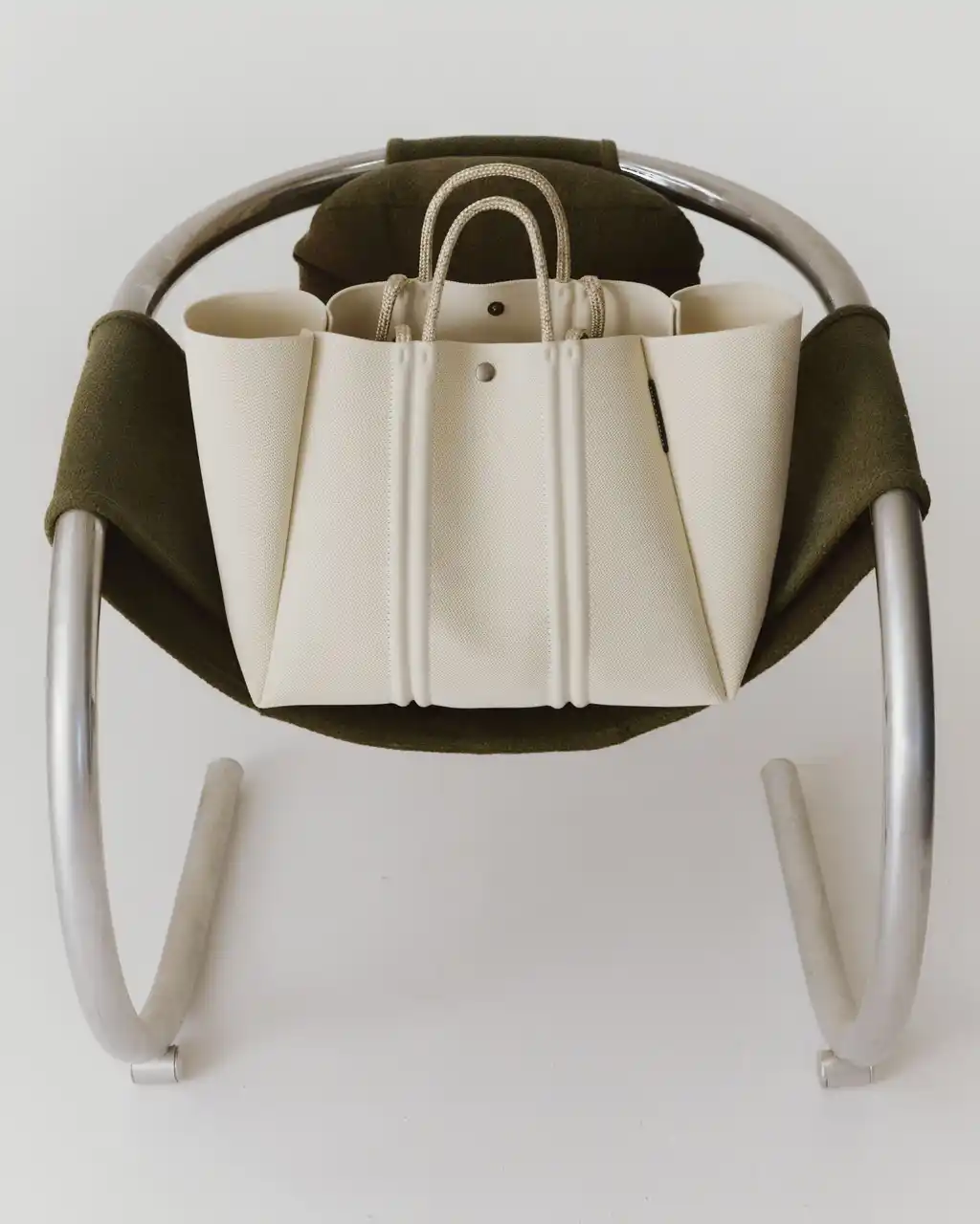 イベント後半となる3月11日(水)からは、先行販売第二弾として、ブランドのシグネチャーでもあるネオプレン素材を使用したダブルハンドル仕様の新作バッグが登場します。 今回は、洗練された佇まいを引き立てる特別なカラーパレットをまとってラインナップ。外側はミニマルに、内側にはさりげない彩りを。バッグを開けた瞬間に心が弾むような配色を施しました。肩掛けとハンドキャリーの両方に対応するダブルハンドル仕様により、シーンやスタイルに合わせた持ち方が可能に。軽量で柔らかなネオプレン素材の心地よさも相まって、日常のさまざまなシーンに寄り添う新作です。 |