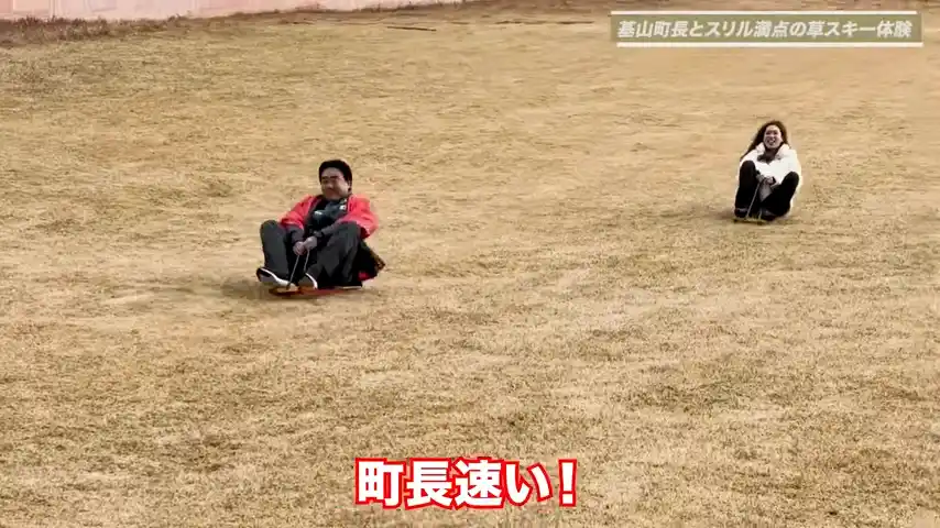 | 今回の『首長と○○やってみた』では、基山山頂から木そりで滑り降りる「草スキー」に挑戦します!想像以上のスピードに、竹下アナウンサー絶叫!? | ||||||||||