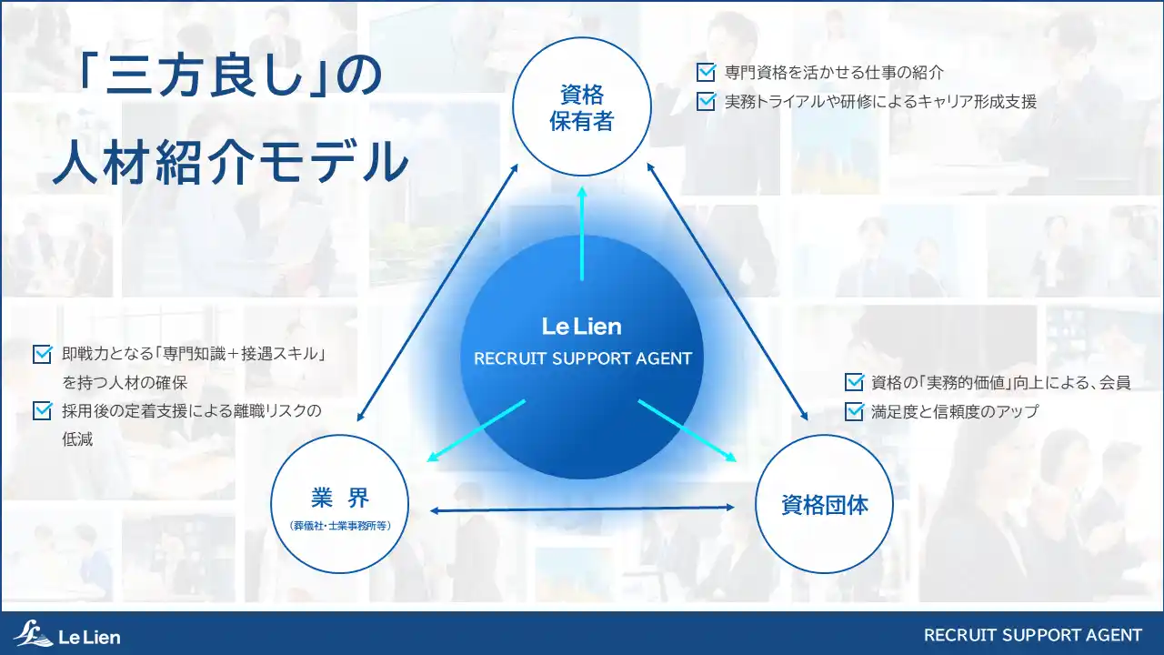 当社は、これまでの事業で培った全国の士業・葬儀社ネットワークと、各種資格団体との提携を活かし、以下の「持続可能な人材紹介モデル」を構築します。 |