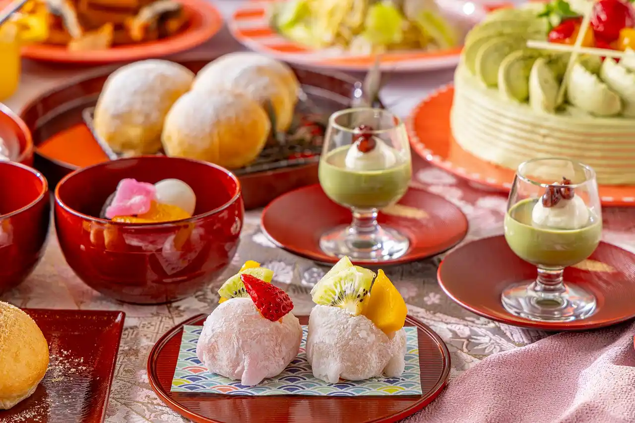 デザートコーナーには、和の素材を生かしたスイーツが並びます。ランチタイムには、イタリアの定番菓子を和風にアレンジした「きなこのボンボローニ」が登場。さらに5月7日からは、平日限定で「フルーツ大福」も加わります。そのほか「抹茶のショートケーキ」「抹茶プリン」「白玉あんみつ」「モンブランタルト」「黒糖シュークリーム」など、多彩なラインアップをご用意しております。 |