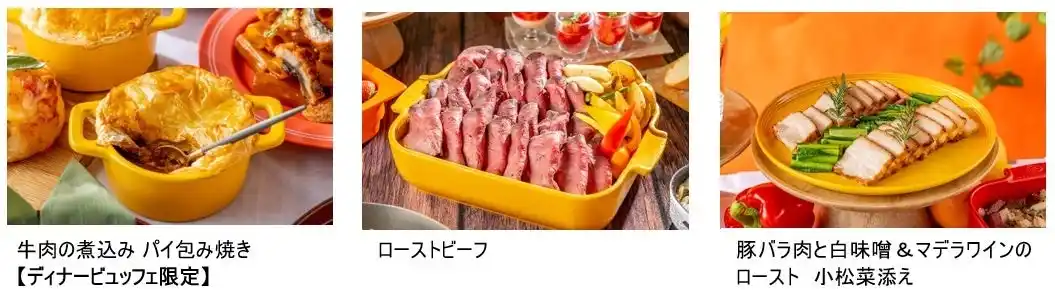 ローストビーフ、豚バラ肉と白味噌&マデラワインのロースト 小松菜添え、鶏胸肉の山賊焼き 青海苔風味のポテト添え、白身魚の白ワイン蒸し ラビゴットソース、ビーフ&マッシュルームピラフ、ラザニア、ローリングピッツァ、菜園風ピッツァ、本日の蒸し野菜、白胡麻のアイオリソース、ミネストローネスープ、神戸ハイカレー(限定50食)、牛肉の煮込み パイ包み焼き【ディナービュッフェ限定】