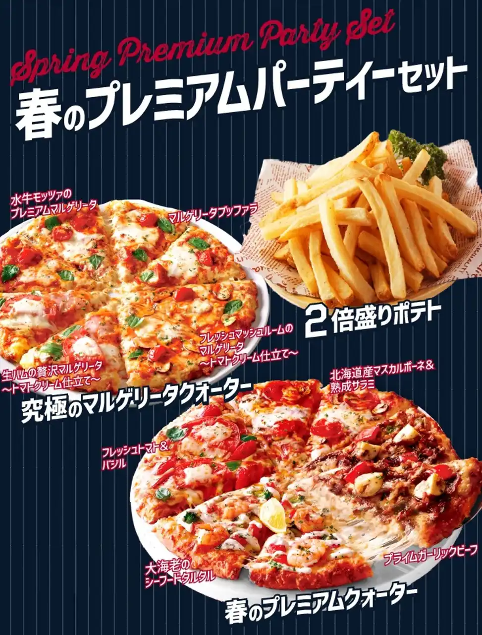 新作を含むプレミアムクォーターと王道ピザを組み合わせた贅沢な内容。大人数での観戦会や春の集まりを一気に盛り上げる、ボリューム満点のセットです。 |