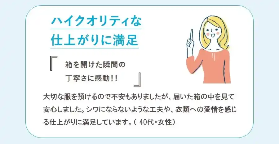 2010年のサービス開始以来「家まで取りに来て届けてくれるうえ、仕上がりもよいのでリピートしています」「きれいな状態で箱入りで届き、天地無用シールも貼られていて、洋服への愛情を感じました」「冬物のコートをクリーニング店に持って行くのは一苦労なので、利用しています。またお願いします」など、持ち運びが不要な点や仕上がりがうれしいなど、数多くの喜びの声をいただいており、リピート率80%の実績(昨年対比)となっています。 |