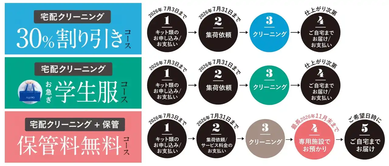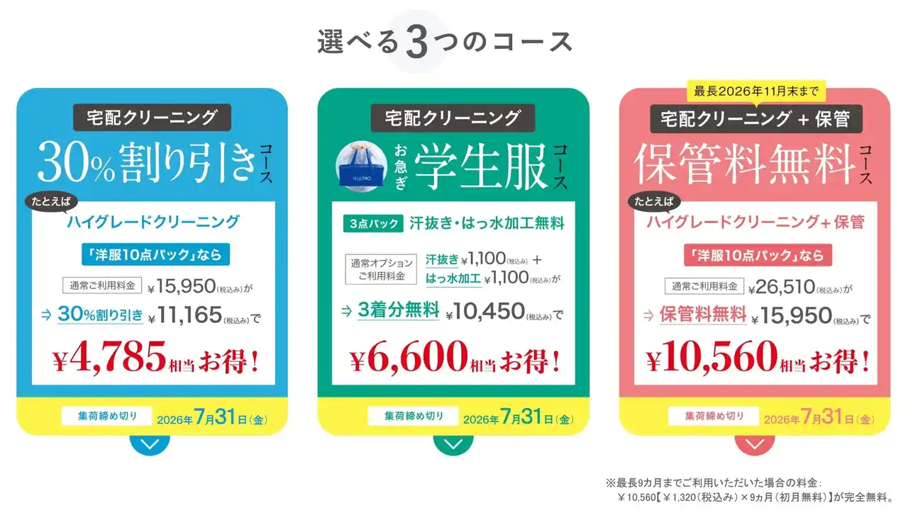 レギュラーサービスの30%割り引きでご利用いただけるコースと、11月末まで保管料無料で専用施設でお預かりするコースをご案内しています。昨年より新たに汗抜き・はっ水加工が無料のお急ぎ学生服コースもできました。集荷期限はいずれも2026年7月31日(金)まで。 |