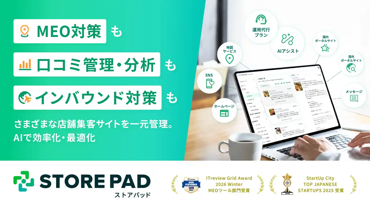 STOREPADは、国内外のさまざまな店舗集客メディアと連携する、店舗情報発信・分析プラットフォームです。地図アプリ・ポータルサイト・インバウンド向けメディア・SNS・HPなど様々な媒体への一括情報発信や口コミ分析で工数削減と集客向上、効果的なMEOを実現。店舗運営を成功に導きます。 |
