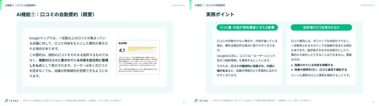AI搭載型の店舗情報発信・分析プラットフォーム「STOREPAD(ストアパッド)」を提供するイクシアス株式会社(本社:東京都中央区、代表取締役社長 CEO:内藤 崇司)は、Googleマップにおける生成AI関連の機能と、それが店舗運営に与える影響をまとめた解説資料「MEO×AIで店舗集客はどう変わる?Googleマップの最新AI機能を徹底解説」を公開いたしました。 |
