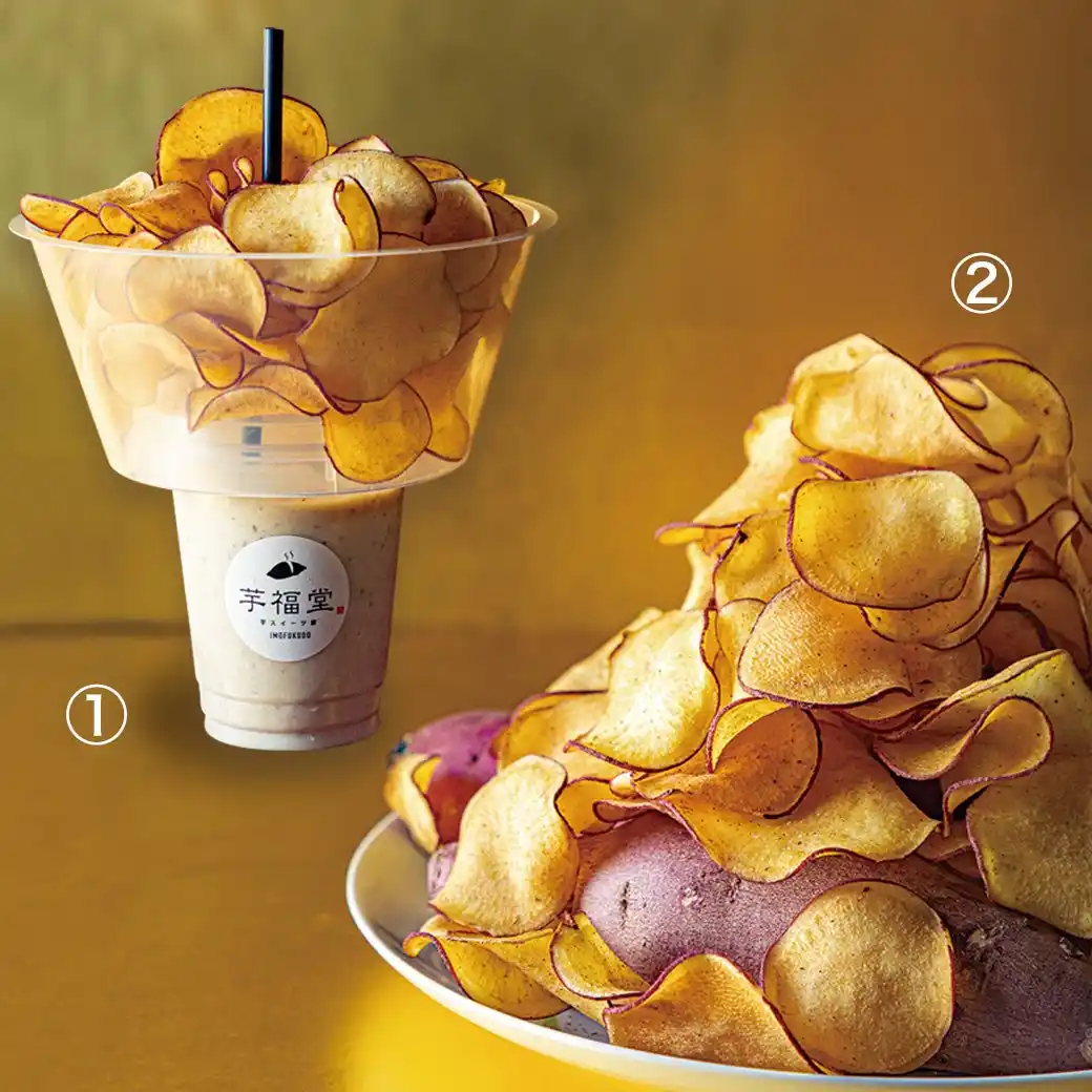紅はるかと国産牛乳だけで作った焼き芋ドリンクと紅あずまを使用したパリッと香ばしいチップスを楽しめます。 |