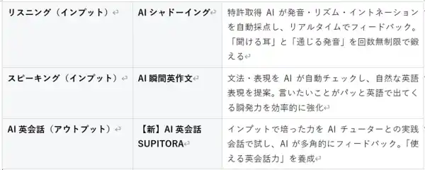 主要機能:AIシャドーイング採点 / AI瞬間英作文 / AI英会話「SUPITORA」