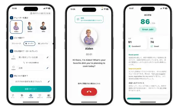 複数のAIチューターと、ビジネスから日常まで多彩なシーン(会議室・空港・レストランなど)から選択。自分とAIの役割やトピックを自由に設定して実際の会話で試せます。1回の会話は短時間で完結するため、自宅やオフィスなど声を出せる環境で手軽に英会話の場数を増やせます。