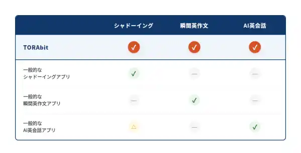 AI英会話「SUPITORA」の追加により、TORAbitは「AIシャドーイング」、「AI瞬間英作文」、「AI英会話」の3機能統合の英語学習プラットフォームへと進化しました。日常・ビジネス・海外出張・会議など幅広いシーンをカバーする2,000以上の教材と、1回3分から「練習 → 採点 → 改善」が完結する効率的な学習設計で、忙しいビジネスパーソンの英語力向上をサポートします。