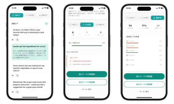 会話終了後、AIが会話の総合スコア・文法添削・語彙分析(CEFR※2レベル分布)など複数の観点で詳細にフィードバック。「ただ話して終わり」ではなく、毎回の会話から改善点が明確になります。