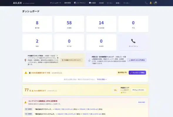 AILEXは弁護士事務所専用のAI法務支援クラウドSaaSです。民事訴訟・家事事件・刑事事件・債務整理・労働事件など16カテゴリ70種類以上のAI文書生成テンプレート、20種類のAIエージェントツール、AI証拠説明書自動生成、複数文書クロス分析などの機能を搭載しています。独自のPII自動マスキング技術により、弁護士の守秘義務に配慮したAI活用を実現しています。