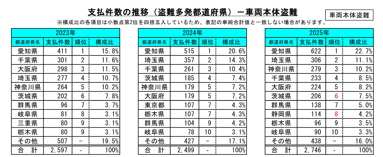 ・2025年の車両本体盗難の支払件数(盗難多発都道府県)は、愛知県が2位の埼玉県と比較して、約2倍の件数を占めており、都道府県別車両本体盗難の支払件数割合も増加傾向となっている。