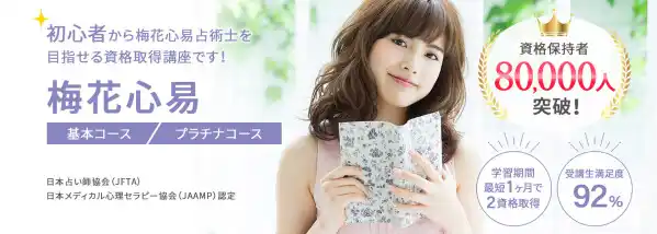 講座で学ぶ内容は日本占い師協会の「梅花心易占術士」(https://www.uranai.org/baika/)、日本メディカル心理セラピー協会の「梅花心易アドバイザー」(https://www.domap.net/uranai/baika/)それぞれの資格試験対策になっています。