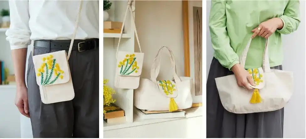 ピープルツリーでは、職人が一針一針手刺繍をほどこしたミモザモチーフのバッグやブローチも展開。春の装いにさりげないメッセージを添えます。 |