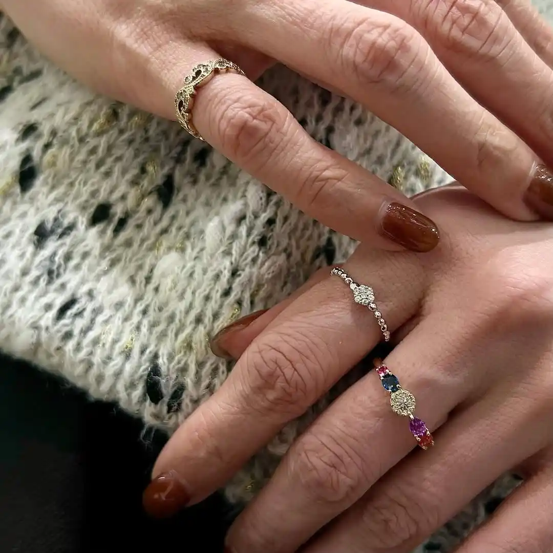 春の気配を思わせるやさしい色合いを、ゆとりのある間隔で配しました。向きや角度を揃えすぎず、一粒ごとの個性を活かした指環です。 |