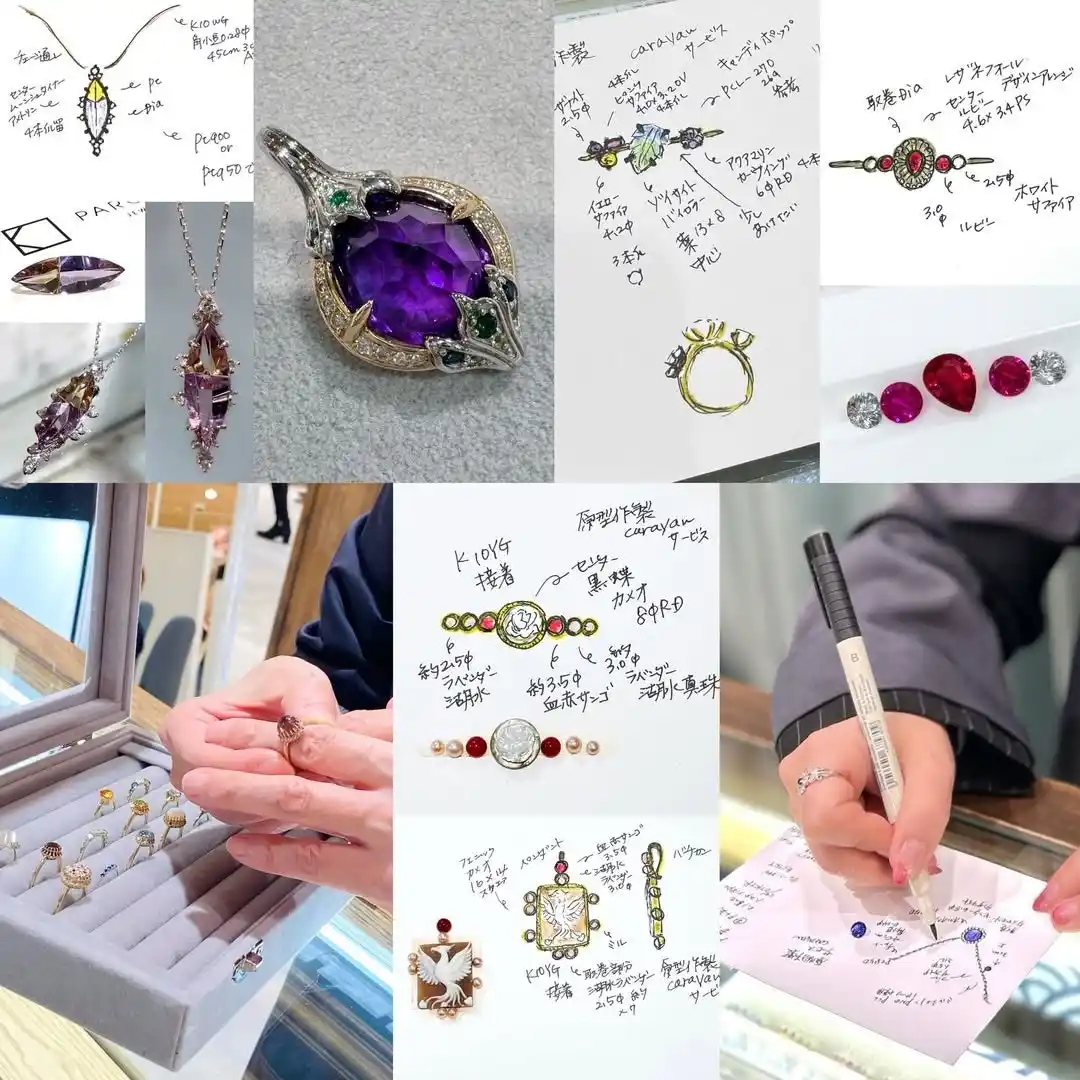 既存デザインをもとに宝石をお選びいただくセミオーダーに加え、その場でデザイン画を描きながら形を組み立てていくフルオーダーのご相談も承ります。宝石の個性を見ながらデザインを考えていく、来店イベントならではの時間をお楽しみいただけます。 |
