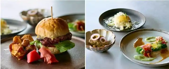 左)【阪神梅田本店限定】ろくそう定食(1人前)2,530円 右)1.へしこの炙りブルスケッタ(1人前)550円、2.福井県の梅干しと身欠きニシン~じゃがいものバルサミコ和え~(1人前)374円、3.リコッタチーズと山菜~花脊の木の芽の香り~(1人前)352円 |