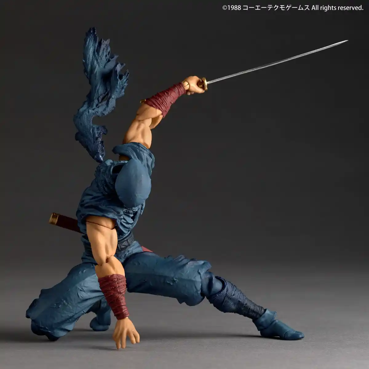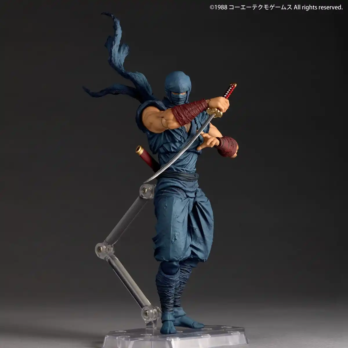 クラシックな忍者装束の各部や可動でなびくマフラーには、布の質感やダメージ状態のディテールを緻密に施しました。逞しい両腕を大きく前後スイングできる肩甲骨可動をはじめ、独自の可動ギミックで力強くしなやかな忍者アクションポーズを決められます。顔を隠した覆面の下から覗く鋭い瞳には、眼球可動ギミックを搭載。 |