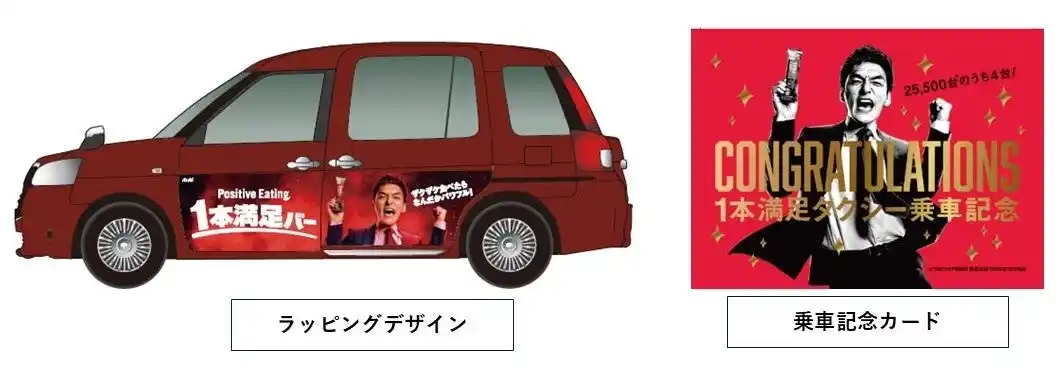 3月9日から5月4日まで東京都内限定で「1本満足バー」デザインのフルラッピングタクシー4台が走行します。乗車記念としてオリジナルのカード配布を行い、移動時でのブランド接触機会を創出します。(タクシー内広告は4月6日より放映) |