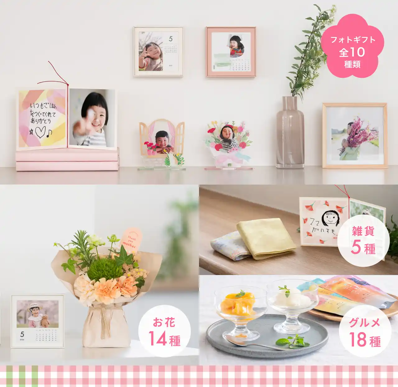 | 5月10日(日)の母の日に合わせて「みてね」では、ご家族の心のつながりに寄り添いたいという想いから、フォトギフト(全10種)に、お花(全14種)・グルメ(全18種)・雑貨(全5種)を組み合わせた「みてね母の日ギフト2026」をご用意しました。 | |||||||||||||||||||||