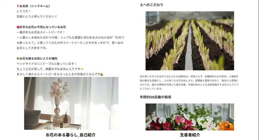 本コミュニティは、「お花をもっと好きになる」をコンセプトに、お花好きのユーザーと生産者が直接つながる場です。ユーザーと生産者による双方向のコミュニケーションの中で、花の情報や生産者の想いに触れることで、花のある暮らしをより深く楽しむきっかけを提供します。 |