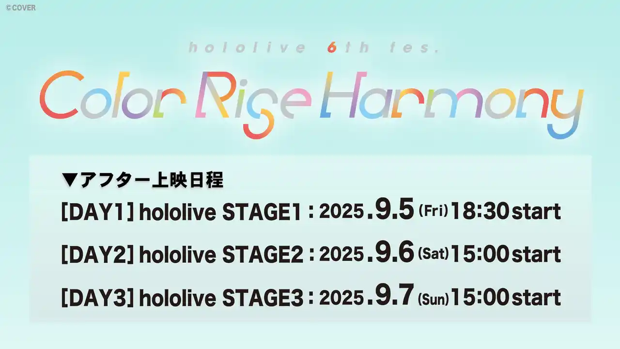 「カバー株式会社(本社:東京都港区、代表取締役社長:谷郷元昭)は、弊社が運営する女性VTuberグループ「ホロライブ」において、今年3月に実施された全体ライブ『hololive 6th fes. Color Rise Harmony』のアフター上映が2025年9月5日(金)6日(土)7日(日)に開催されることをお知らせいたします。
