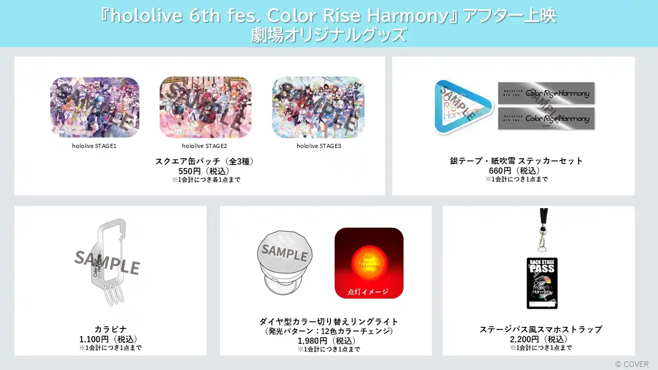 | 「カバー株式会社(本社:東京都港区、代表取締役社長:谷郷元昭)は、弊社が運営する女性VTuberグループ「ホロライブ」において、今年3月に実施された全体ライブ『hololive 6th fes. Color Rise Harmony』のアフター上映が2025年9月5日(金)6日(土)7日(日)に開催されることをお知らせいたします。 | |||||||||