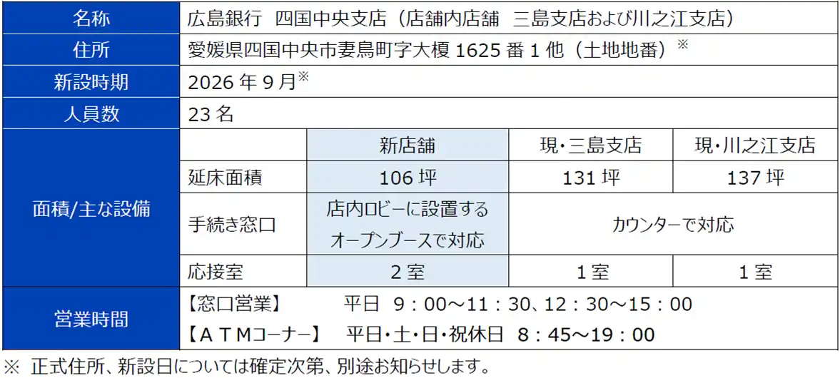 【株式会社 広島銀行】 『四国中央支店』の新設と三島支店および川之江支店の移転について