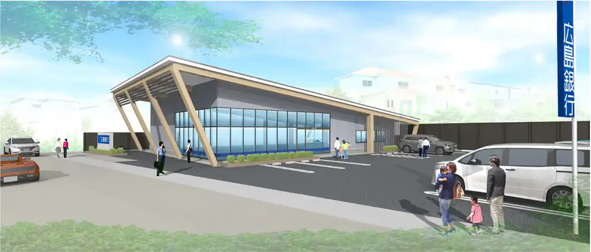 | 新店舗は、四国中央市のロゴマーク「おりなすロゴ」をイメージした、特徴的で開放感のある外観デザインを採用します。店内には、ご案内や各種手続き用のカウンターは設置せず、ロビーに設けたオープンブースにて受付を行います。また、ゆったりとご相談いただける応接室を複数準備することで、地域の皆さまに親しみを感じていただき、気軽にご利用いただける店舗を目指しています。 | |||