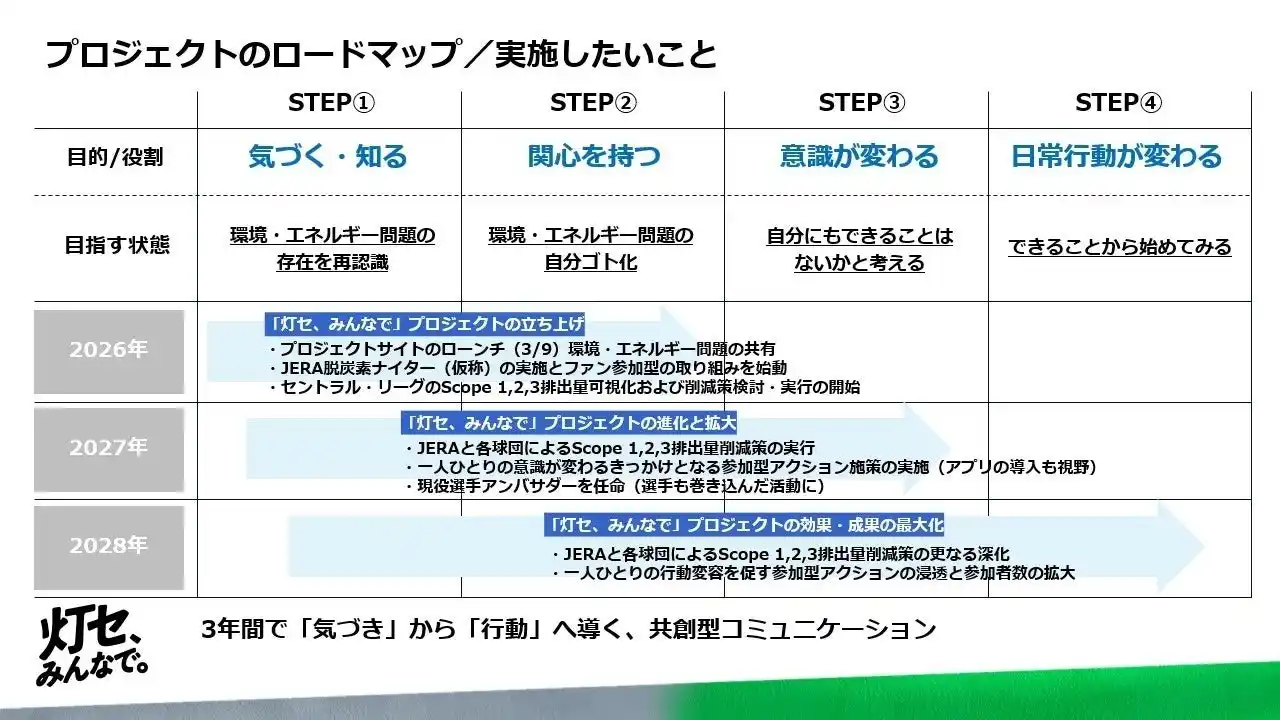 1年目は、環境・エネルギー問題に気づき、知っていただくことを目標とし、一部冠試合のクリーンエネルギー化、プロジェクト特設サイトローンチ、SNSでの参加型施策など、球場内外でファンの皆さまとともに取り組んでまいります。2年目、3年目では、ファンの皆さまの環境への意識が高まり、最終的にはファンの皆さまが日常で行動に移していただけるようにプロジェクトの取り組みや発信の仕方を進化させてまいります。 |