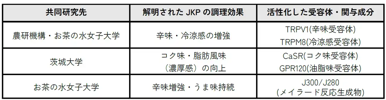 | (料理の辛味を際立たせる効果)およびJ280(うま味の余韻を長く持続させる効果)が、味を変化させる正体であることを突き止めました。 | |||||||||