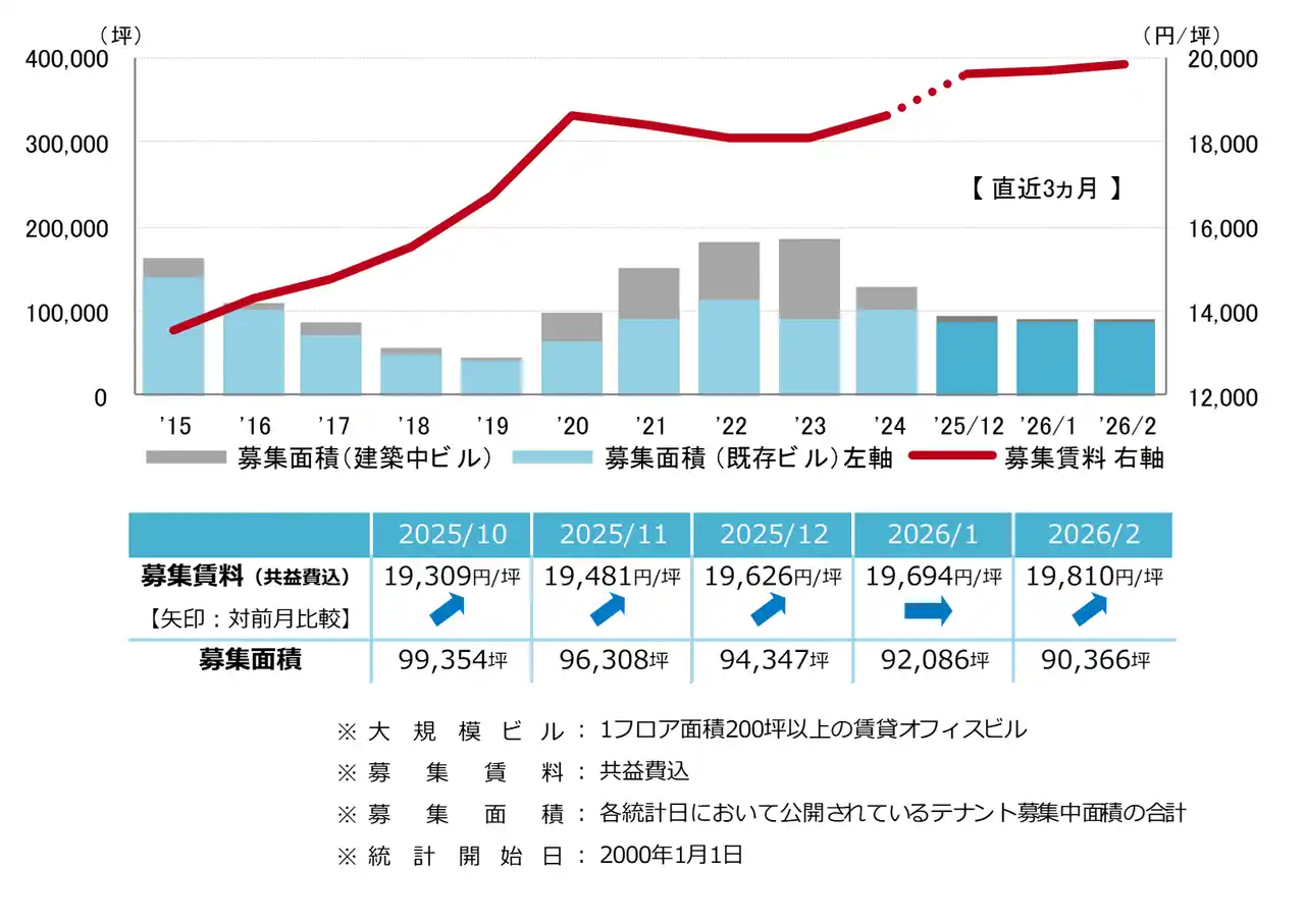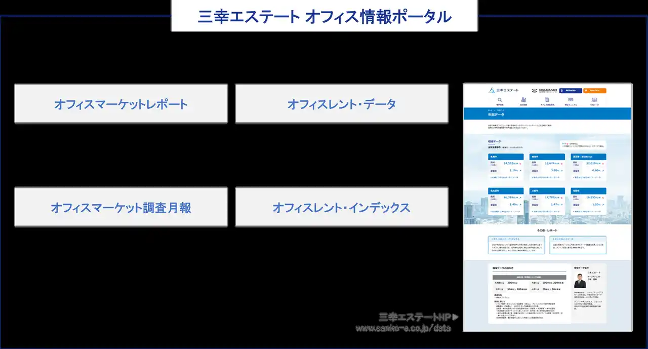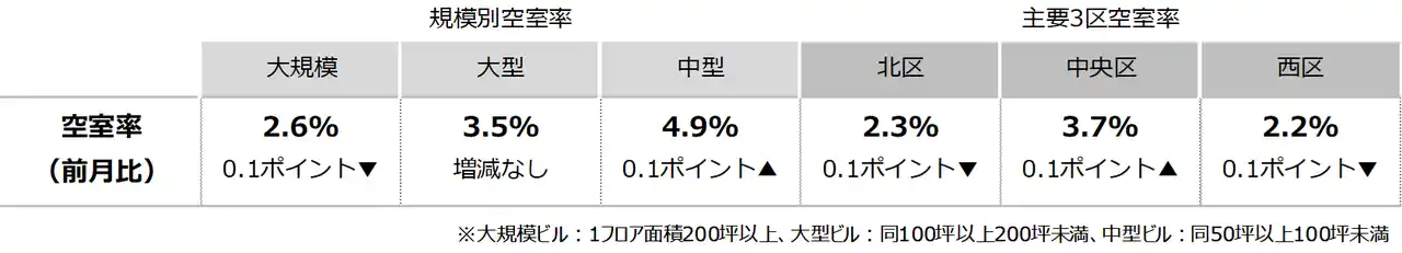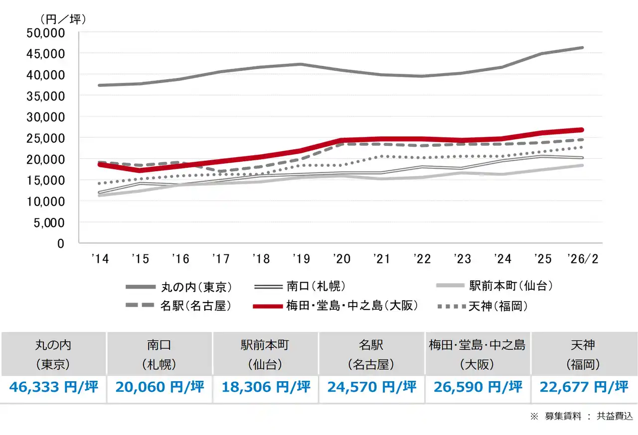 三幸エステート株式会社(本社:東京都中央区、取締役社長:福島正二郎)は、2026年2月度の大阪市オフィス賃貸状況(空室率&現空面積:大規模、募集賃料&募集面積:大規模、規模別空室率、主要3区※1空室率:大規模)および全国6大都市(東京・札幌・仙台・名古屋・大阪・福岡)の大規模ビルのマーケットデータをまとめた「オフィスマーケット2026年3月号大阪」を公表します。 |