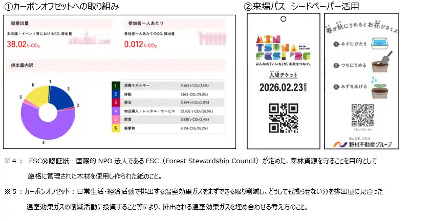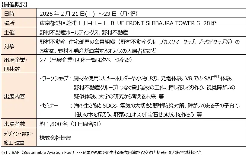 野村不動産ホールディングス株式会社(本社:東京都港区/代表取締役社長:新井 聡、以下「野村不動産ホールディングス」)、野村不動産株式会社(本社:東京都港区/代表取締役社長:松尾大作、以下「野村不動産」)は、2026 年2 月21 日(土)~2 月23 日(月)の3 日間、野村不動産 住宅部門の会員組織(野村不動産グループカスタマークラブ、プラウドクラブ等)のお客様、野村不動産が運営するオフィスの入居者様などを対象としたサステナビリティイベント「みんつなフェス!2026」を、グループ本社である「BLUE FRONT SHIBAURA TOWER S(ブルーフロント芝浦)」にて開催しました。 |
