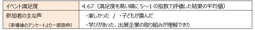 開催期間3 日間で、約1,800 名にご来場いただき、終了後の来場者へのアンケートでは平均満足度4.67(5段階中)を獲得、約7 割の方より「次回以降もぜひ参加したい」との回答をいただきました。 |