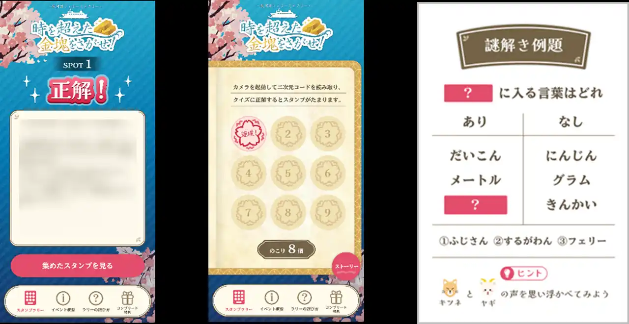 | お手持ちのスマートフォンでフェリー乗り場に掲出されたポスターやチラシに記載の二次元コード(QRコード)を読み込むところからスタート。物語は、江戸時代からタイムスリップしてきた男「金兵衛」とともに、金塊の行方を追うオリジナルストーリーが展開されます。参加者は、各スポットに設置されたQRコードを読み込むことで出題される謎に挑戦。正解を導きながら次の目的地へと進んでいき、物語の先にある謎の答えを見つけ出します。 | |||||||||