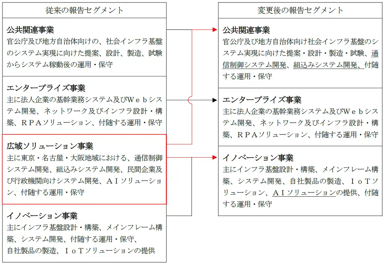 | 当社は、事業シナジーの最大化及び経営の効率化を図るため、本日別途発表の「組織変更及び人事異動のお知らせ」のとおり、組織体制を再編いたしました。これに伴い、マネジメントアプローチによる事業ポートフォリオ管理を従来の「公共関連事業」「エンタープライズ事業」「広域ソリューション事業」「イノベーション事業」の4セグメントから「公共関連事業」「エンタープライズ事業」「イノベーション事業」の3セグメントに変更いたします。 | |||