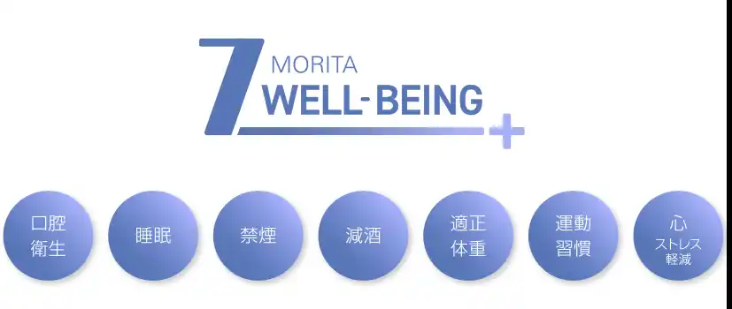 | 歯科健診、健康診断、ストレスチェック等の結果から、「7つの健康課題=MORITA 7WELL-BEING」を設定し、従業員の健康管理を行っています。特に口の健康と全身の健康と深いかかわりがあることを認識し、従業員の健康を維持向上させる施策のひとつとして、「歯科健診受診率100%」を掲げ、2014年度(4月1日~翌3月31日)から11年連続で達成しています。 | |||