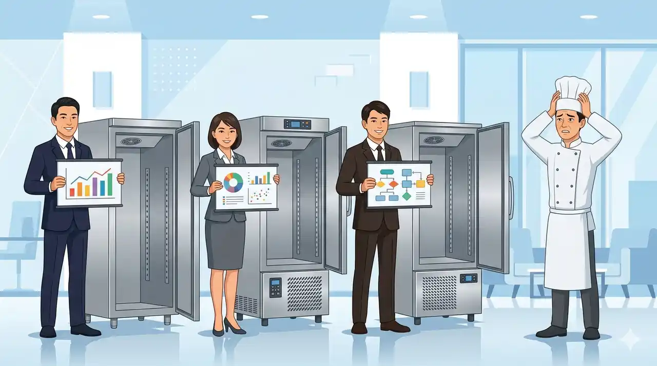 各社の凍結装置の能力を測定する条件が違うので、凍結能力の比較が正しく行いづらい現状がある。 |