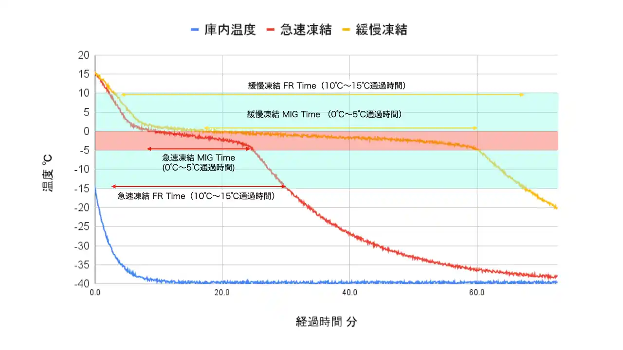凍結時に発生する氷結晶の大きさに直結する温度帯(0℃~-5℃)の通過時間 |