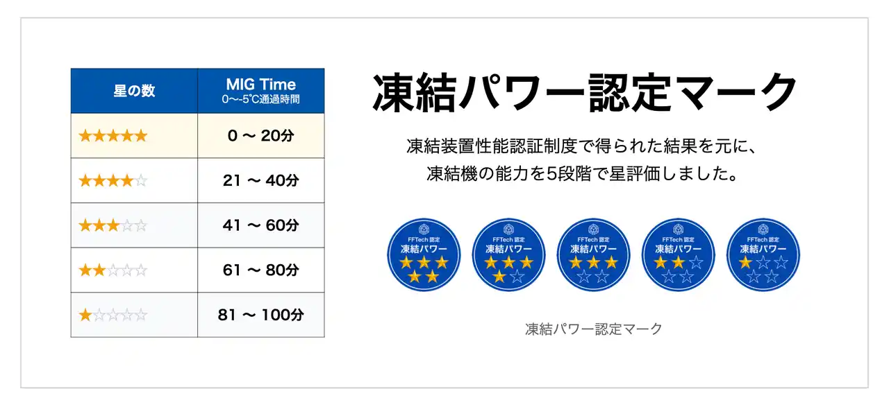 凍結装置性能認証制度で得られた「MIG Time(0℃~-5℃通過時間)」に基づき、凍結能力を5段階の星評価で分かりやすく可視化します。 |
